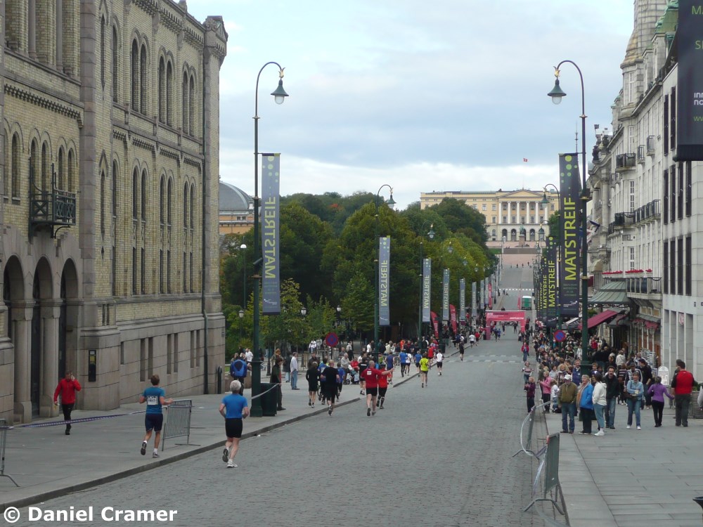 beim Oslo-Marathon zu, der an diesem Tag quer durch Oslo, mit dem Ziel