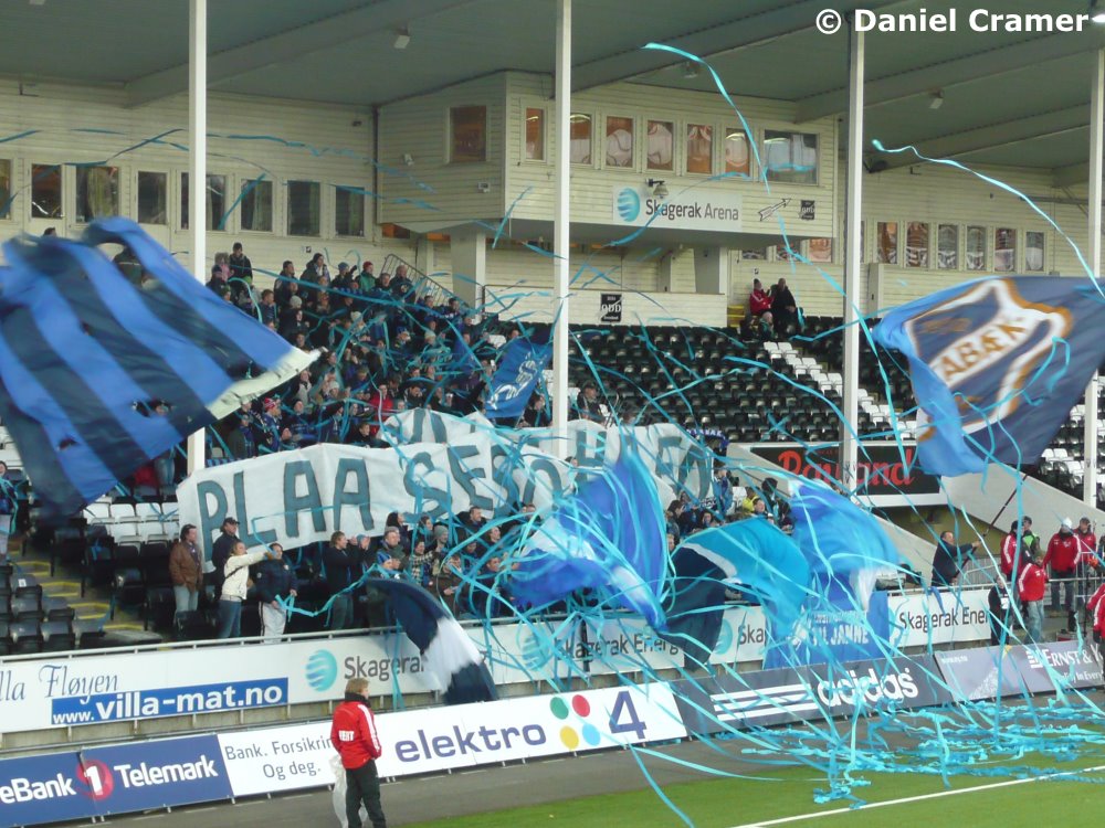 sein, denn überall war Skien heute mit Odd-Grenland-Fahnen
